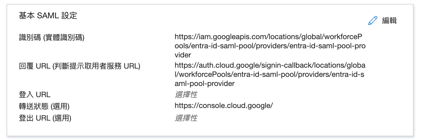 WORKFORCE_PROVIDER_ID:工作團隊身分集區提供者 ID,您稍後在本文件中建立工作團隊身分集區提供者時會用到,例如:entra-id-saml-pool-provider在「Reply URL (Assertion Consumer Service URL)」欄位中,輸入重新導向網址。使用者成功登入後,系統會將他們重新導向至這個網址。如要設定控制台 (聯盟) 的存取權,請使用下列網址格式: