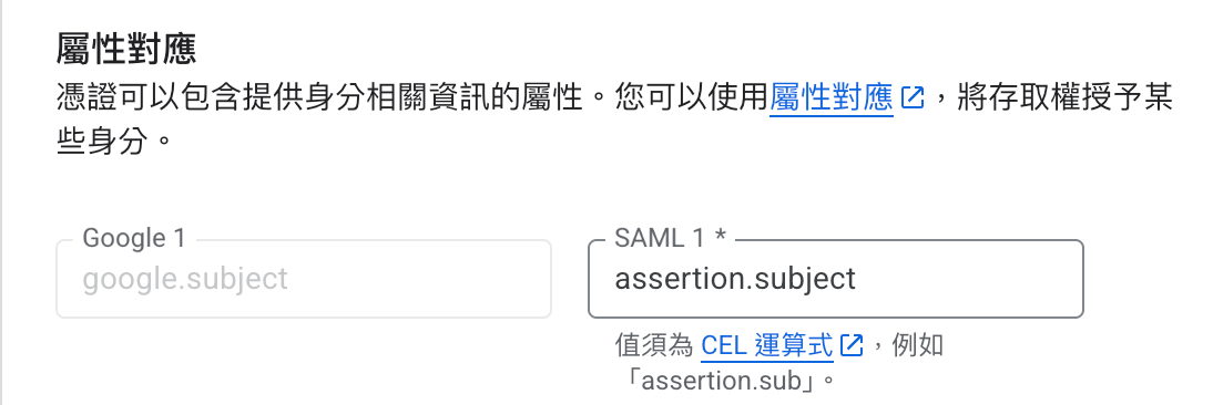 - 在「屬性對應」中,輸入 google.subject 的 CEL 運算式。